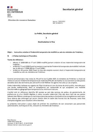 Ci-dessous l'instruction du Secrétaire Général du Ministère de l'Intérieur sur l'ITM ainsi que l'extrait du Journal Officiel portant sur les postes ouverts à ce titre.
